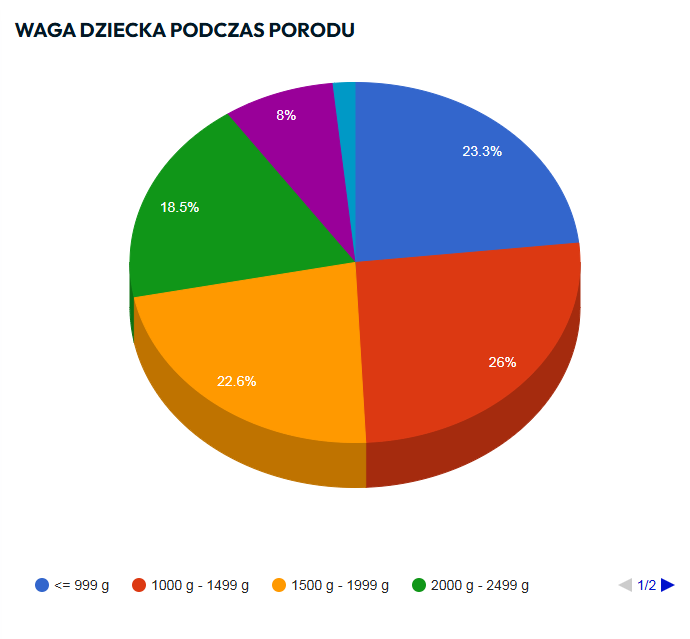 Rozkład wagi urodzeniowej jest bardzo zbliżony w przypadku trzech z pięciu analizowanych zakresów, tj. poniżej 1000 g, od 1000 g do 1499 g oraz od 1500 g do 1999 g, i wynosi odpowiednio: 23,28%, 25,97% i 22,62%. Dzieci z wagą urodzeniową w zakresie 2000 g do 2499 g było 18,53%, zaś tych ważących ponad 2500 g – 9,61%. Mediana wyniosła ok. 1517 g, zaś średnia arytmetyczna wagi dziecka na podstawie analiz spisowych wyniosła 1526 g.