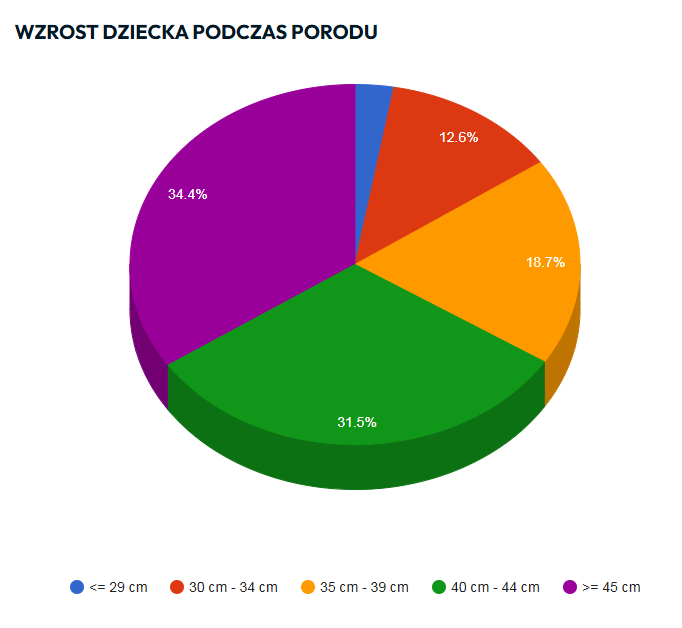 Rozkład wzrostu dzieci, które objęte były spisem, analizowany był w przedziałach 5 cm w zakresie od 30 do 44 cm z uwzględnieniem zakresów poniżej 29 cm oraz powyżej 45 cm wzrostu. Dominującym przedziałem był zakres powyżej 45 cm (34,43% wszystkich wskazań) oraz zakres 40-44 cm (31,48% wszystkich wskazań). Mediana wyniosła 42,5 cm, zaś średnia arytmetyczna wzrostu dziecka na podstawie analiz spisowych wyniosła 41,30 cm.