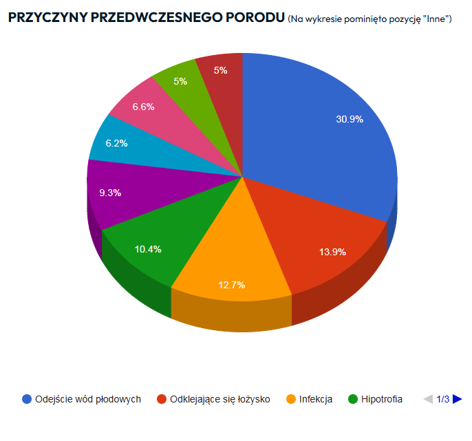 W 2025 r. zaktualizowaliśmy ankietę spisową umożliwiając wskazanie jednej z 9 predefiniowanych przyczyn oraz odpowiedzi „inne”. Finalny rozkład przyczyn przedwczesnych porodów (z pominięciem odpowiedzi „inne”) prezentuje się w sposób następujący: odejście wód płodowych – 30,93%, odklejające się łożysko – 13,92%, infekcja – 12,71%, hipotrofia – 10,40%, nieznana – 9,28%, ciąża bliźniacza – 6,62%, niewydolność szyjki macicy – 6,19%, zespół HELLP – 4,98%, stan przedrzucawkowy – 4,98%.