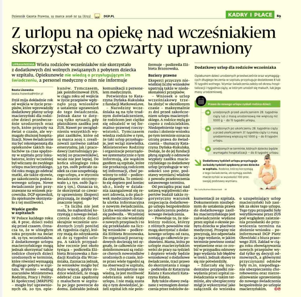 W Dzienniku Gazecie Prawnej – dodatek dla prenumeratorów Kadry i Płace – z dnia 19 marca 2026 r. ukazał się artykuł „Z urlopu na opiekę nad wcześniakiem skorzystał co czwarty uprawniony” autorstwa p. Beaty Lisowskiej. Wynika z niego, iż wielu rodziców wcześniaków nie jest świadoma przysługujących im przywilejów. Za zgodą redakcji (dziękujemy!) publikujemy materiał zapraszając do lektury.
